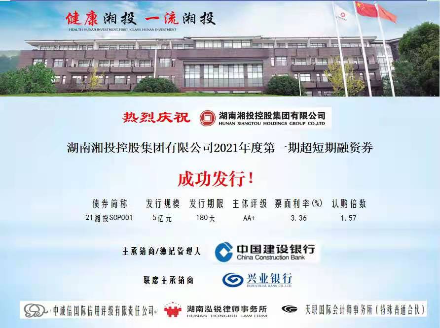 湖南日报·华声在线1月15日讯(记者 李小华 通讯员 徐颖 邹丰林)近日,湖南湘投控股集团有限公司(简称:湘投集团)成功发行2021年第一期超短期融资债券,债券金额为5亿元,期限180天,票面利率3.36%,认购倍数为1.57倍。