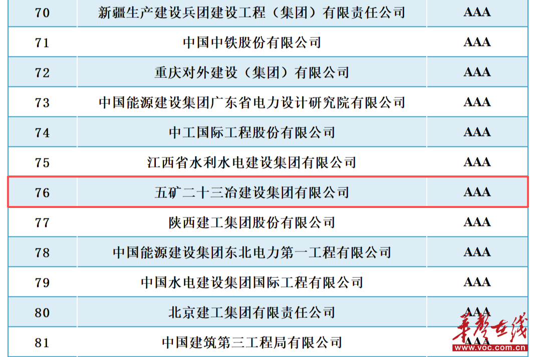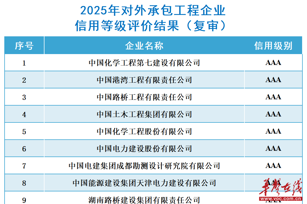 华声在线11月17日讯(通讯员 刘涌)近日,中国对外承包工程商会正式发布2025年中国对外承包工程商会企业信用等级评价结果。五矿二十三冶建设集团有限公司(以下简称“五矿二十三冶”)顺利通过对外承包工程AAA级信用企业复审(在三年有效期内进行的等级复核),至此,该公司已自2014年首次获评以来,连续12年保持AAA信用等级。