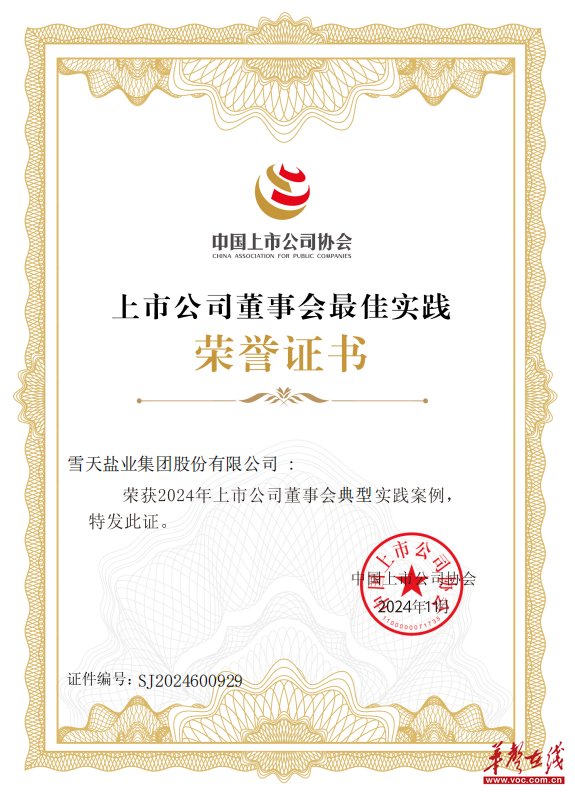 雪天盐业获得中国上市公司协会“上市公司董事会典型实践案例”