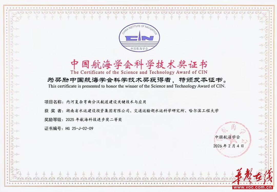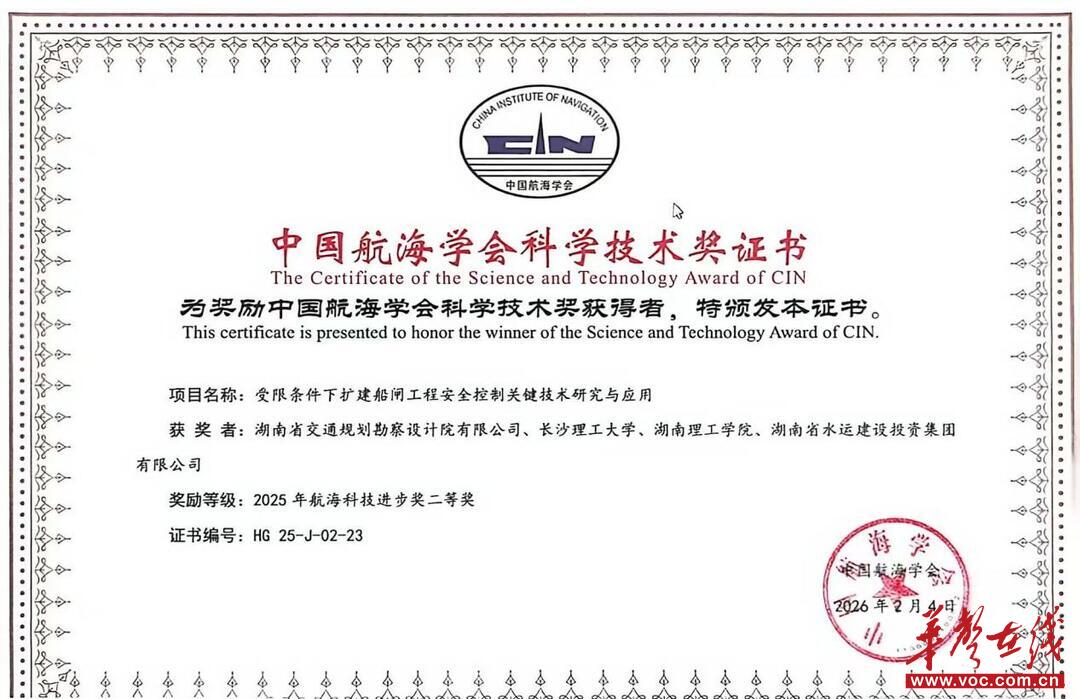 华声在线2月6日讯(通讯员 周千凯)近日,2025年度中国航海学会科学技术奖获奖项目揭晓,湖南省港航水利集团有限公司下属湖南省水运建设投资集团有限公司(以下称“省水运投”)两项成果《内河复杂弯曲分汊航道建设关键技术与应用》和《受限条件下扩建船闸工程安全控制关键技术研究与应用》荣获2025年度“科学技术进步奖二等奖”。此次获奖标志着省水运投在国内航海工程技术领域取得重要突破,充分体现了省水运投在项目建设中坚持品质工程导向、强化品牌建设的显著成效。